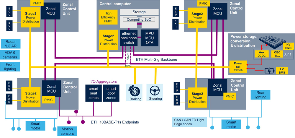 E/E 아키텍처(그림 1)는 최신 차량의 기반을 이루며, AI 중심으로 점점 더 발전하는 첨단 기능을 구현한다. 이 시스템에서 마이크로컨트롤러와 마이크로프로세서는 실시간으로 정보를 처리하고 명령을 물리적 동작으로 변환해야 하므로 중요한 역할을 수행한다. 자율주행 시스템의 스티어링 움직임이나 전자식 시트 조정, 실내 온도 조절과 같은 기능의 정밀도와 반응성은 데이터 처리 요소의 정교한 상호 작용에 달려 있다.