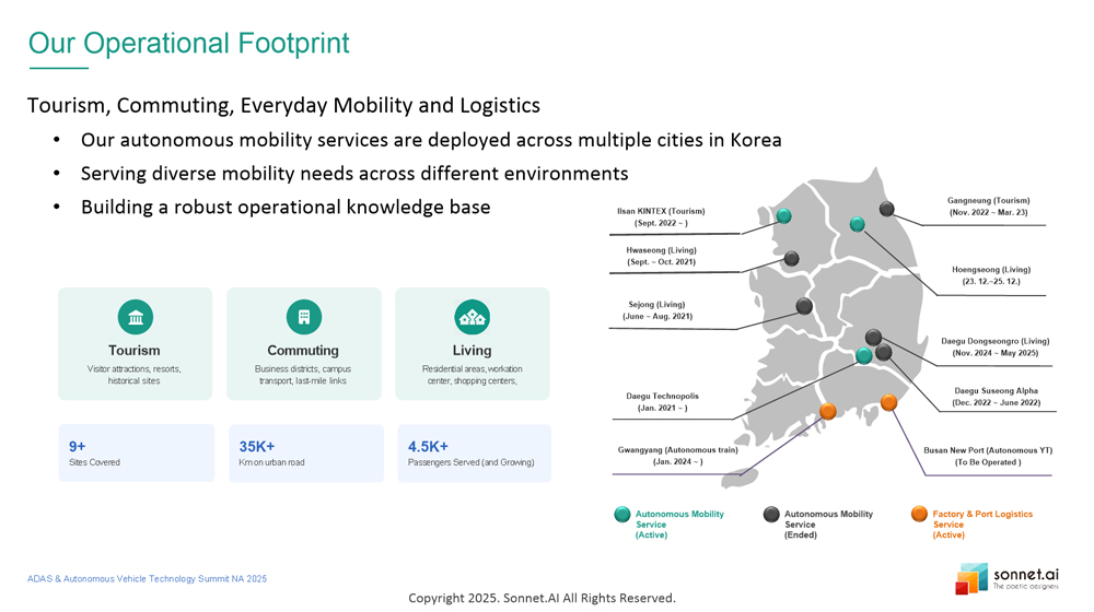 Today, Sonnet.AI operates in nine cities across Korea, having accumulated over 35,000 kilometers of accident-free urban driving and *more than 4,500 passengers.