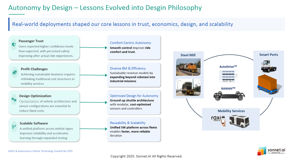 At AVTS North America 2025, Dr. Joonwoo Son, founder of Sonnet.AI, delivered a keynote titled “Autonomy by Design: Real-World Lessons Shaping the Roboshuttle Vision.” He emphasized that autonomous driving must move beyond a race of sensors and algorithms to become something that people genuinely trust — shaped by comfort, real-world experience, and operational reality.