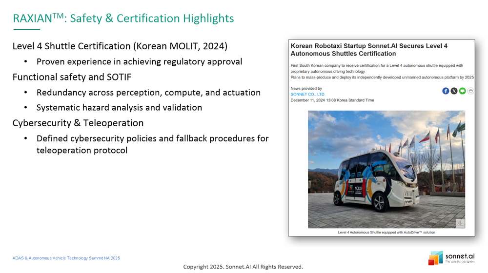 In 2024, the company earned Korea’s first Level 4 autonomous shuttle certification awarded to an SME, incorporating functional safety, SOTIF, and redundancy across perception, computing, and control. Cybersecurity and teleoperation safeguards further reinforce the system’s reliability.