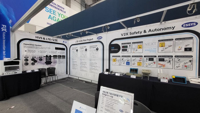 이씨스 전시 부스에서는 LTE-V2X 차량 단말기(OBU), LTE-V2X 노변 기지국(RSU), 중앙 통합 관제 플랫폼, HyperVisor 기반 IVI(차량용 인포테인먼트) 시스템(HVS & LTE-V2X) 등 실물 장비를 전시하고, 실시간 교통혼잡 감지 및 사고 경고 시스템을 시연했다.