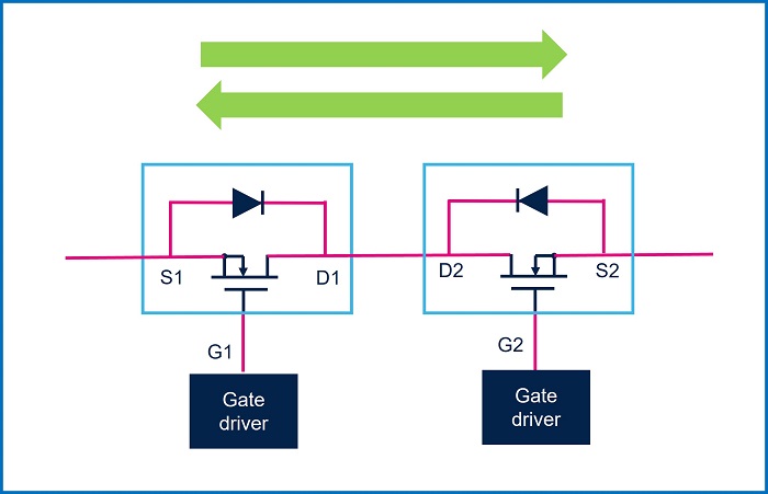 공통 드레인이 있는 두 개의 N 채널 MOSFET에 대한 B2B 구성을 사용하여 BPS를 만들 수 있다(