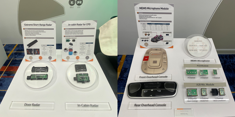 초근거리 도어 레이더와 CPD(Child Presence Detection)용 실내 레이더 모듈(좌). MEMS Microphone Module(A2B 인터페이스).
