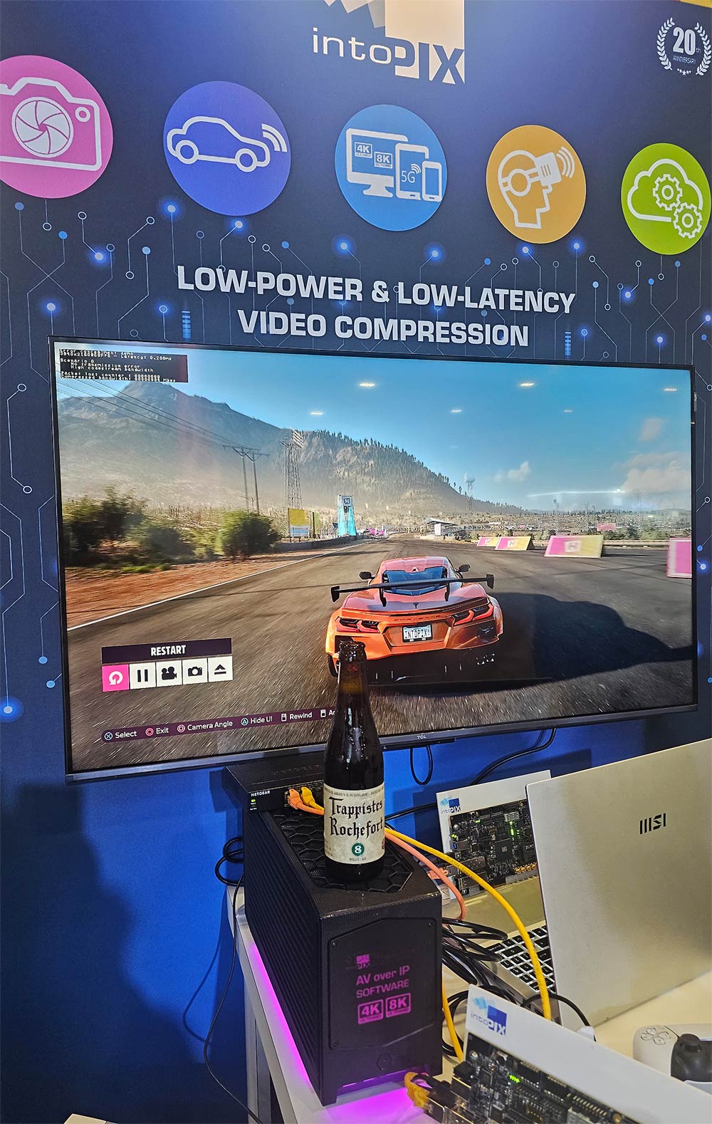 At CES, intoPIX used a PS5-based “wireless gaming” demo to let visitors feel compression first. Beer was served: Belgian Trappistes Rochefort 8, brewed at the Trappist monastery brewery in Rochefort, Wallonia.