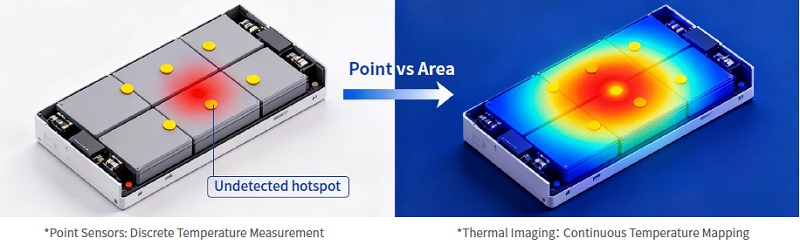 레이싱크는 적외선 열화상 기술이 이러한 공백을 보완한다고 강조한다. 이 기술은 배터리 표면 전체와 주변 환경에 대해 비접촉 방식으로 연속적인 온도 시각화를 제공할 수 있는 보완적 모니터링 방법으로 제시된다. 이 접근법은 포인트 센서만으로는 포착하기 어려운 국소적 핫스팟, 비정상적인 온도 구배, 초기 열 변화 추이를 식별할 수 있도록 한다.