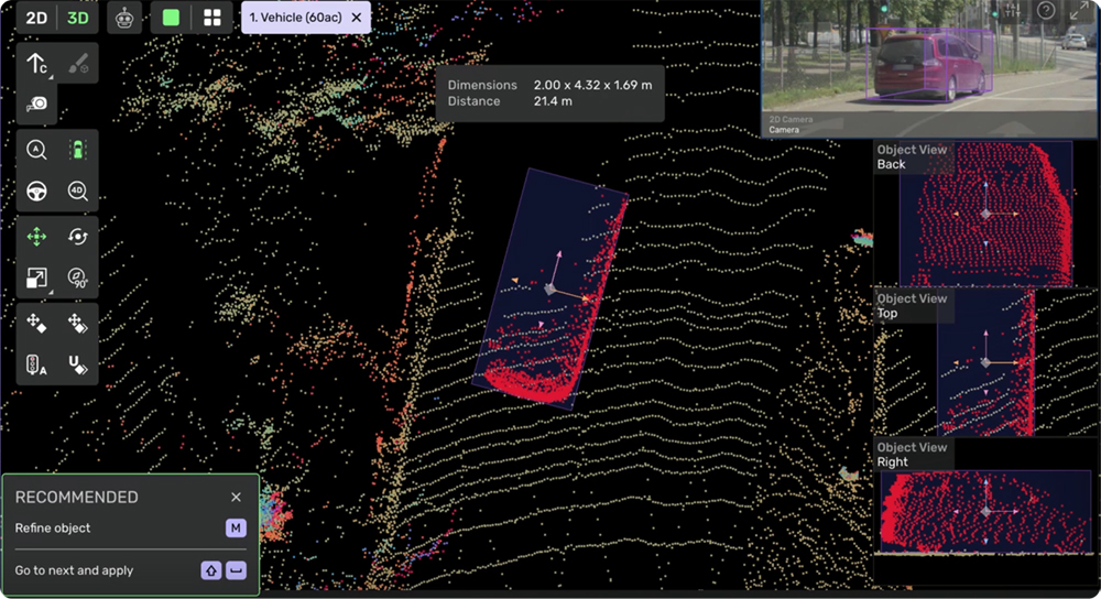 라이다 포인트클라우드와 카메라 데이터를 결합해 차량과 객체를 3D로 주석화하는 모습. 자율주행 성능은 이런 데이터 품질에서 출발한다.