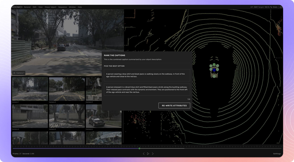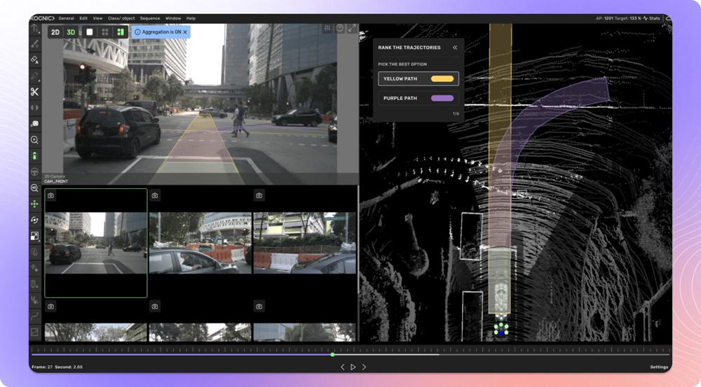 우리는 이런 문제를 해결하기 위해 많은 노력을 기울였습니다. Kognic 플랫폼은 시퀀스 기반 멀티 센서 데이터 처리를 지원하며, 센서 모달리티 차이, 차량의 움직임(ego motion), 시간 차이 등을 보정하면서도 작업 속도와 비용 효율성을 유지할 수 있도록 설계됐습니다.