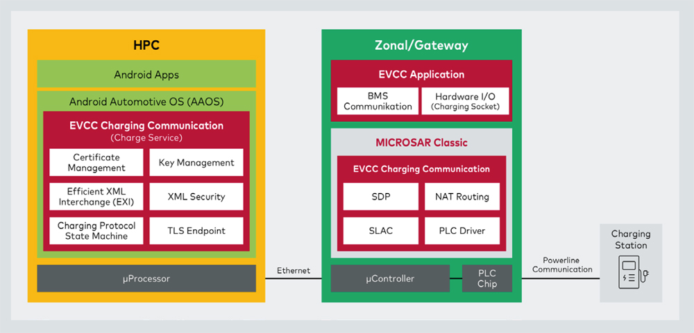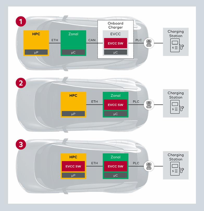 SDV로의 흐름은 무엇보다도 현대적인 E/E 아키텍처의 구조에 반영돼 있다. 이런 아키텍처는 대개 조널 아키텍처로 구성된다. 차량은 지리적 영역으로 나뉜다. 마이크로컨트롤러 기반의 영역별 ECU 및 센서/액추에이터 ECU 외에도, 중앙 고성능 컴퓨터(HPC)는 SDV의 필수적인 구성 요소다. 이들은 강력한 프로세서와 POSIX 기반 운영 체제를 갖춘 시스템 온 칩(SoC) 형태로 구현되는 경우가 많다. 조널 아키텍처에 EVCC를 구현하는 데에는 다양한 접근 방식이 있다. 한 가지 가능성은 앞서 언급한 온보드 충전기이다. 이는 E/E 아키텍처의 특정 영역에 별도의 구성 요소로 통합된다