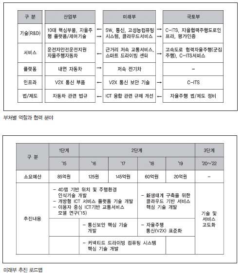 자동차는 종합예술이기 때문에 정부의 여러 부처가 협력해야만 한다. 자동차는 하드웨어 중심에서 소프트웨어기반의 스마트 교통 서비스 산업으로 확장해 나가고 있다. 미래창조과학부는 이와 관련 ICT 기반의 자율주행 핵심 기술을 개발하고 이를 다양한 시범사업을 통해 새로운 서비스 모델을 만들 계획이다. R&D부문에서 클라우드 맵, 주행 상황인지 소프트웨어, 개방형 OS 플랫폼, V2X 및 보안에 포커스해 클라우드 기반 교통 서비스 및 센터 개발을 계획 중이다.