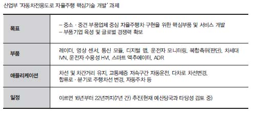 산업부는 국내 자율주행차의 기술력을 높이기 위해 7년 국책과제로 3,000억 원 규모의 ‘자동차전용도로 핵심기술 개발사업’을 추진하고 있다. 기획재정부와 함께 현재 예비타당성 조사 중인 이 사업은 이르면 내년부터 시작된다. 레이더, 영상 센서, 통신 모듈, 디지털 맵, 운전자 모니터링, 복합측위 차세대 차량 네트워크, 운전자 수용성 휴먼 차량 인터페이스(HVI), 스마트 액추에이터, 자동차용 추측항법 등을 핵심부품 10개로 선정해 차선 및 차간거리 유지, 다차로 차선변경 등 애플리케이션 관련 부품의 국산화에 나선다.