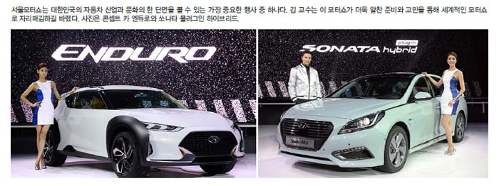 그렇다면, 서울모터쇼는 세계적인 모터쇼로 발돋음하는 것이 불가능할까? 단순히 동네 모터쇼로 만족할 것인가? 이웃 세계5대 모터쇼인 도쿄모터쇼를 벤치마킹할 것은 없는 것일까?