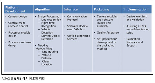 PLK는 카메라 기반 ADAS 제품에서 ▶카메라 디자인, 카메라 멀티 컨텍스트 제어, 프로세서 모듈 디자인, 프로세서 소프트웨어 디자인 등의 플랫폼 개발 ▶차선 인식, 차량 감지, 이동사물 감지 등 이미지 프로세싱과 트래킹 알고리즘의 개발 ▶통신 프로토콜, 소프트웨어 업데이트, 진단 등 인터페이스를 개발하고 있습니다.