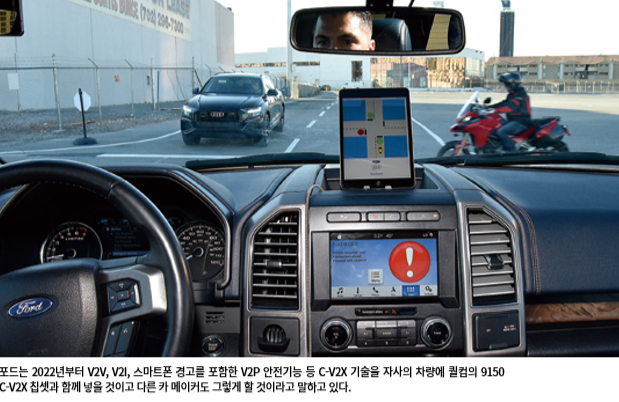 포드는 CES에서 어떻게 C-V2X로 교통신호등, 정지 표지판 없이 사거리에서 차량이 우선 통행을 위한 교섭을 진행하고 통행할 수 있는지를 시연했다. 포드는 2022년부터 V2V, V2I, 스마트폰 경고를 포함한 V2P 안전기능 등 C-V2X 기술을 퀄컴의 9150 C-V2X 칩셋과 함께 자사의 차량에 넣을 것이고 다른 카 메이커도 그렇게 할 것이라고 말하고 있다.