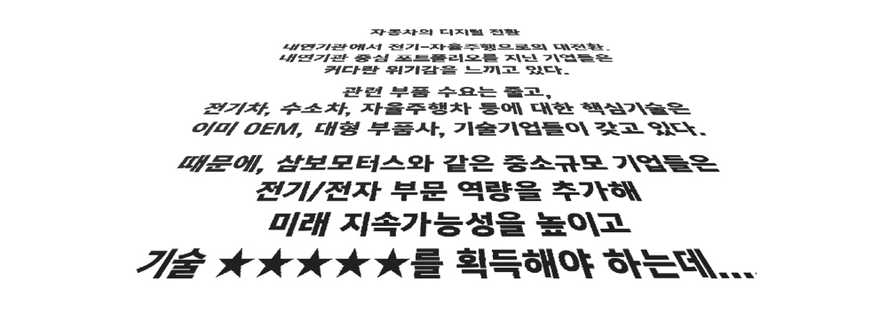 지난여름, 쌍용자동차를 방문해 코란도 e-Motion을 만났을 때 C-필러 델타 패널에 STPM이란 새로운 HMI를 적용시킨 삼보모터스에 주목했었다. 엔진, 연료, 기어 시스템, 내외장 사출품을 주력으로 하는 회사가 전장사업을 추진하고 있었기 때문이었다. 신년호를 준비하면서 다시 한번 이 회사를 찾았다. 이번엔 미래를 향한 전통적인 기계 부품사의 디지털 전환 노력, ‘기술 5스타’ 획득 과정을 말하기 위해서다. 이 글은 『삼보모터스의 ‘숨은’ 키패드 電裝』의 후속편이자 프리퀄(Prequel)이다.