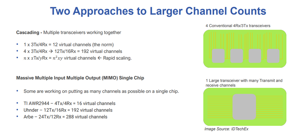 테슬라가 사용한 당시의 ARS4-B에는 8개 채널이 있었다. 이후 업계는 12개 채널로 이동했다. 현재는, 콘티넨탈의 최신 레이더 ARS 540(with NXP)은 192개 채널을 갖고 있다. 이처럼 레이더 산업에는 OEM, 티어 1 및 주요 플레이어들의 투자와 함께 상당수의 기업이 혁신적인 레이더 제품을 내고 있다. 예를 들어, 알베이(Arbe), 오큘리(Oculii)와 같은 플레이어는 완전한 이미징 레이더 제품을 공급할 뿐만 아니라 발레오와 같은 티어 1과 협력해 새로운 레이더 디자인에 들어가 있다. NXP 등 전통적인 칩 업체를 비롯해 마그나의 192채널 ICON 레이더로 유명한 운더(Uhnder), 메타웨이브(Metawave), 에코다인(Echodyne), 바야(Vayyar)와 같은 플레이어들이 자동차 산업의 주요 플레이어들에게 핵심 컴포넌트를 공급하려 하고 있다. ‘Automotive Radar 2022-2042’에서 다루는 이들 기업의 레이더는 200개 이상 가상 채널을 갖고 있고, 알베이의 2,304채널처럼 2,000채널 이상을 지원키도 한다.