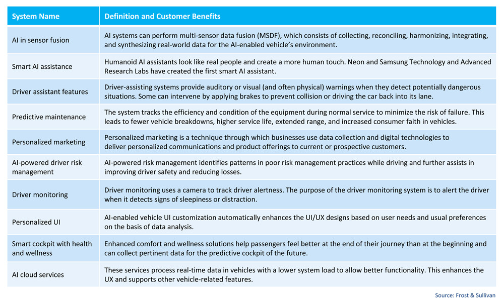 AI의 자동차 적용 분야를 크게 구분한다면, 사람과 관련된 부분과 그렇지 않은 부분으로 나눌 수 있다. 예를 들어, 사람과 관련된 것은 의사결정을 지원하는 챗봇이나 시리, 구글 어시스턴트, 코타나 등 클라우드 기반으로 인카 경험을 개선하는 AI 어시스턴트 같은 시스템, AR-HUD나 e호라이즌처럼 머신러닝을 이용해 의사결정 과정에서 패턴을 식별하는 AI 시스템이 있다. 챗봇은 텍스트나 텍스트 투 스피치를 통해 온라인 대화를 수행해 효율적이고 안전하면서 높은 소비자 경험을 제공할 수 있다. 오래전부터 추구되온 e호라이즌은 운전자가 직접 개입하지 않아도 차량이 전방 도로의 환경적 변화와 상황을 알고 그 반응 시간을 늘려 사고위험을 줄이거나 주행 효율성을 높인다.