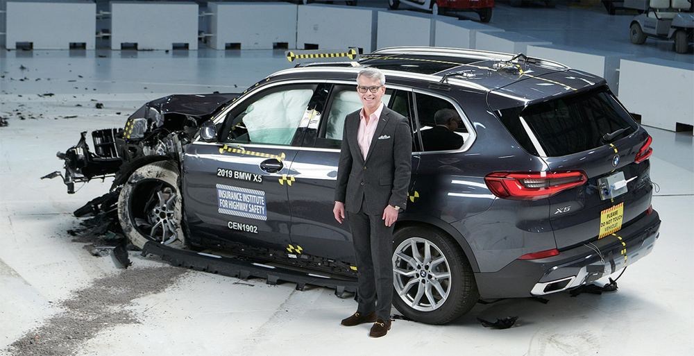 2019년 리어 시트벨트 테스트 중인 BMW X5 앞에서 포즈를 취한 러너. 사진은 내용과 관련없음.
