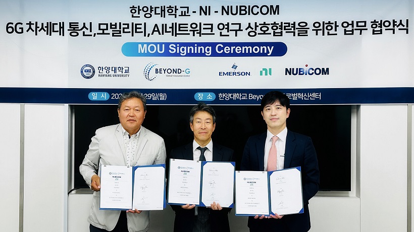 한양대학교 Beyond-G 글로벌혁신센터(센터장 김선우 교수)가 차세대 통신·모빌리티·AI 네트워크 연구와 인재 양성을 위해 글로벌 계측기업 NI(내쇼날인스트루먼트), 국내 파트너사 누비콤과 손잡았다. 세 기관은 9월 29일 한양대에서 업무협약(MOU)을 체결하고 산학연 협력 체계를 강화하기로 했다.