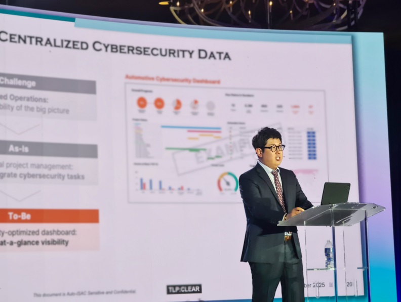류승우 페스카로 사업개발팀장이 Auto-ISAC Cybersecurity Summit 2025에서 차량 통합보안을 위한 디지털전환 전략을 소개하고 있다. [출처=페스카로]
