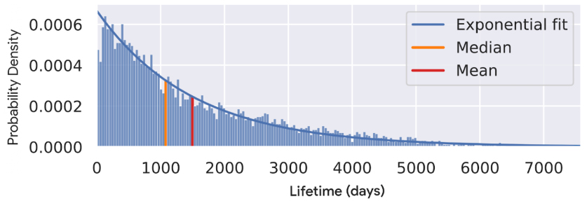 그림 1은 취약점 수명의 분포를 수학적으로 모델링한 것이다. 이 함수는 지수분포를 기반으로 모델링했고, 생애주기 동안의 평균 취약점 수가 주어지면 그 분포가 정해진다. 이 수학적 모델과 실제 사례를 비교한 것이