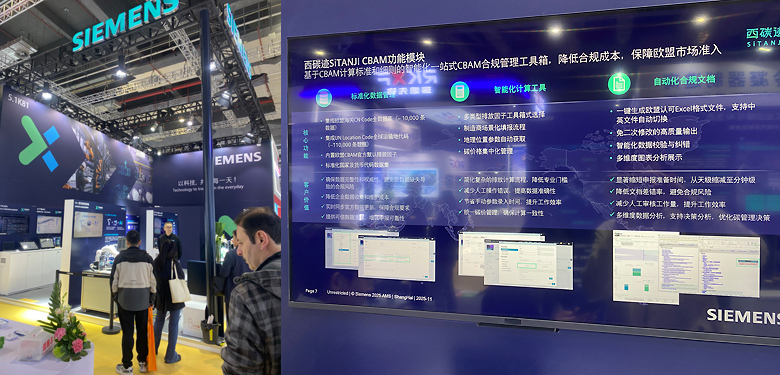 Despite the exhibition’s aftersales focus, Siemens showcased a broad portfolio centered on AI, edge computing, and industrial digital transformation. A Siemens representative explained, “Although this show traditionally targets aftersales, many young engineers and manufacturers visit in China, which gives us a strong reason to present our solutions.” The centerpiece of the booth was the SiTANJI CBAM platform, a localized Siemens tool that enables Chinese companies to automate EU CBAM reporting. The platform supports carbon data standardization (mapping over 100,000 codes), AI-based error validation, automated regulatory document generation, and carbon pricing and risk management. Siemens also highlighted AI-based 360° flexible inspection solutions developed with its Chinese partner DeepVision, along with AI SCADA, AI MES, and the Industrial Edge + Xcelerator ecosystem. Together, these tools form a toolchain that collects and analyzes process data from battery, electronics, and automotive component manufacturers to simultaneously enhance energy efficiency, quality, and predictive maintenance.