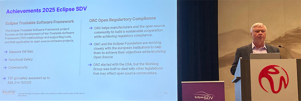 Mike Milinkovich, Executive Director of the Eclipse Foundation, argued that what makes this “automotive-grade” possible is not primarily technology, but governance and accountability structures. If multiple companies build and operate the same code together, “goodwill” is not enough; there must be processes and rules defining who verifies what, maintains what, and proves what. The keywords he used for 2025 - trustable and compliance - are the language that brings open source into the product development lifecycle. As regulations such as the CRA require due diligence and attestation for open-source components, compliance stops being a checklist and becomes a variable that reshapes development methods.