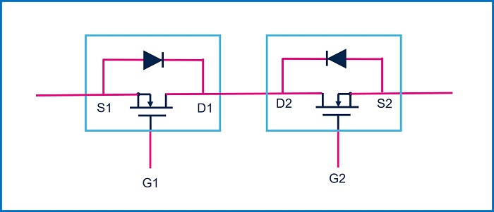 공통 드레인이 있는 두 개의 N 채널 MOSFET에 대한 B2B 구성을 사용하여 BPS를 만들 수 있다(