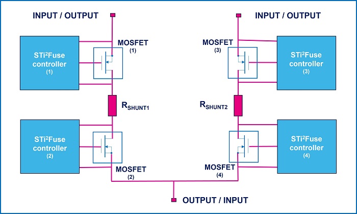 그림 6과 같이 공통 노드에 연결된 두 개의 양방향 라인을 사용하고 STi²Fuse 컨트롤러 VNF1248F로 MOSFET 게이트를 구동하여 구현했다.