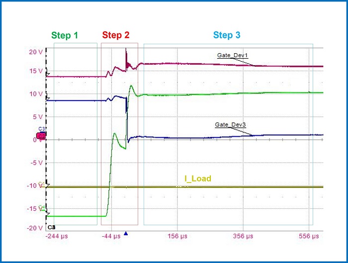 양쪽 레일 라인에서 단락이 발생하면 VNF1248F 디바이스가 부하를 보호하는 역할을 한다. 이러한 디바이스의 반응 시간은 과전류 수준에 반비례하며, 응답 시간은 스마트 퓨즈 내에 구성된 I²t 곡선을 따른다.