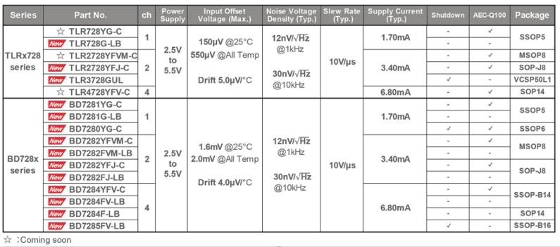 로옴(ROHM)가 자동차, 산업 기기, 소비가전 등 폭넓은 분야에서 활용 가능한 고성능 CMOS OP Amp ‘TLRx728 시리즈’와 ‘BD728x 시리즈’를 출시했다. 이 제품들은 낮은 입력 오프셋 전압, 낮은 노이즈, 높은 슬루율(Slew rate)를 균형 있게 실현한 것이 특징이다.