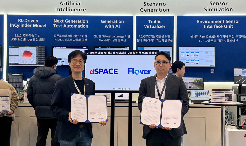 (2026년 3월 18일, 수요일) 글로벌 시뮬레이션 및 검증 솔루션 기업 디스페이스코리아(dSPACE Korea, 대표 손태영)와 자율주행 검증(V&V) 딥테크 스타트업 플로버(Flover, 대표 임동현)가 18일 오토모티브테스팅엑스포 2026(KINTEX)에서 ‘ADAS·자율주행 검증 생태계 고도화 및 차세대 XIL 기반 통합 검증 솔루션 공동 개발’을 위한 업무협약(MOU)을 체결했다.