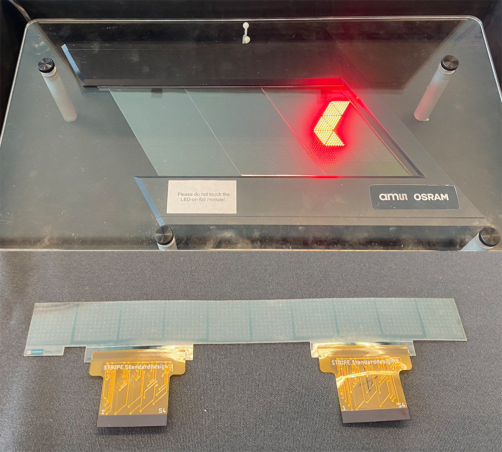 ALIYOS® Rear Combi Lamp 구조. 투명 foil 기판 위에 mini LED 플립칩을 실장해 두께 400μm의 얇고 유연한 리어램프를 구현한다.