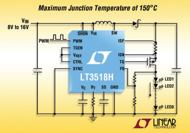 리니어 테크놀로지 코리아가 H급 버전의 LT3518을 출시했다. LT3518은 하이사이드 전류 센스 DC/DC 컨버터로서, 정전류로 고전류 LED를 구동하기 위해 설계됐다. 이 제품은 3~30V의 입력 전압 범위에서 동작하며 40V까지 과도전압 보호 기능을 제공해 자동차, 산업 및 건축 조명 같은 다양한 애플리케이션에 이상적이다. H급 버전은 E급 및 I급 버전의 최대 접합 온도가 125℃인 점과 비교해 최대 접합 온도가 150℃로 동작한다. E, I 및 H급의 모든 전기적 스펙은 동일하다. H급 부품들은 150℃의 최대 접합 온도에서 테스트되며 보장된다. 이 제품들은 주변 온도가 높을 수 있는 자동차 및 산업용 애플리케이션에 이상적이다. LT3518은 12V 입력에서 최대 8개의 300mA 백색 LED를 구동할 수 있으며, 자동차 디스플레이 백라이팅 같은 애플리케이션에 매우 적합하다. LT3518은 LED의 하이사이드에서 출력 전류를 감지해, 벅, 벅부스트, 또는 부스트 구성을 가능하게 한다. 이 제품은 4×4mm QFN 패키지 형태로 제공되며, 부스트 모드에서 최고 90%의 효율을 제공한다. LT 3518은 트루컬러 PWM(True Color PWM™ 디밍(dimming)을 사용하며, 3,000:1 이상의 디밍 범위에서 균일한 LED 컬러를 제공한다. 그 보다 적은 디밍을 처리하기 위해서는, CTRL 핀을 사용해 10:1의 아날로그 디밍을 제공한다. 고정 주파수 및 전류 모드 아키텍처를 이용해 공급 및 출력 전압 범위가 넓어도 안정적인 동작을 보장한다. 또한 주파수 조절 핀을 통해 사용자는 250kHz~2.5MHz 범위에서 주파수를 프로그램할 수 있어 효율을 최대화하면서 외부 부품 크기를 최소화시킨다. LT3518 HUF는 16핀 QFN 패키지로 공급되며, 1,000개 수량 기준으로 개당 3.79달러부터 시작한다.